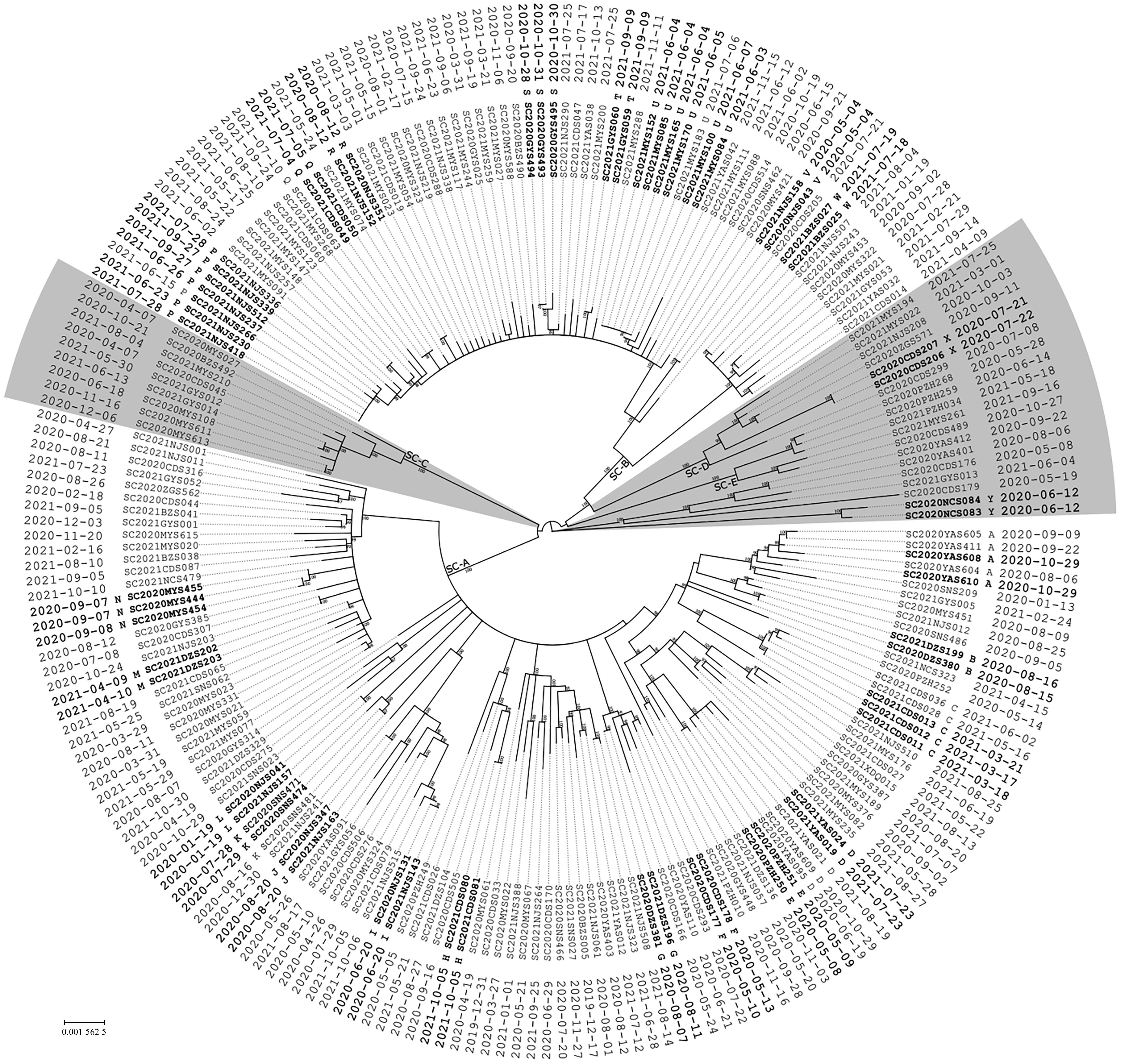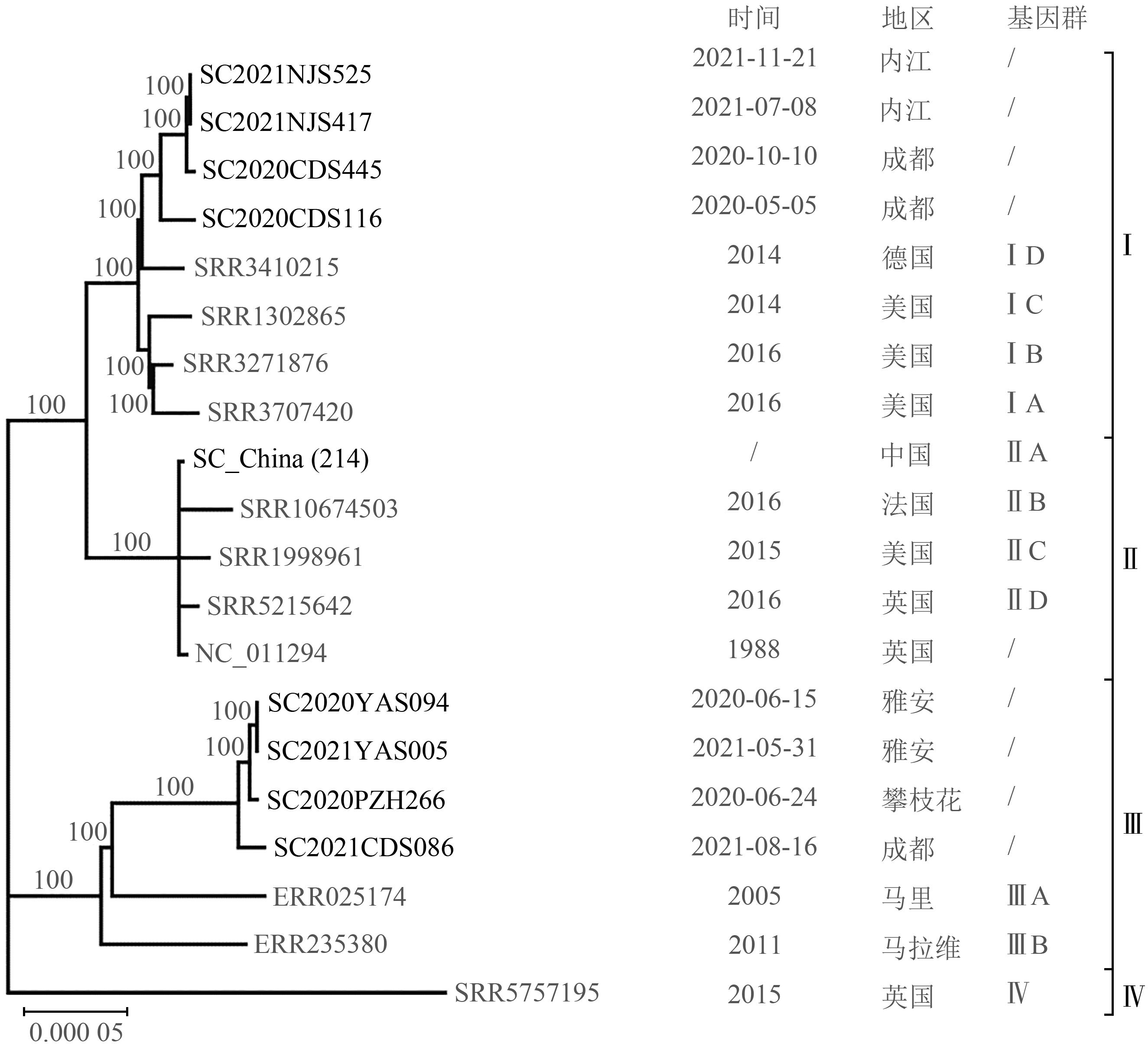 摘要:目的 了解2020—2021年四川省食源性疾病主动监测肠炎沙门菌(SE)的遗传多样性及耐药特征,比较耐药预测表型与药敏检测结果的一致性,为基于全基因组测序(WGS)的暴发预警和耐药预测提供参考依据。方法 以2020—2021年四川省食源性疾病主动监测分离的222株SE为研究对象,开展全基因组测序分析,利用Snippy软件分析菌株单核苷酸多态性并构建系统发育树,利用ResFinder软件进行耐药基因注释和耐药表型预测。采用微量肉汤稀释法测定菌株对15种抗生素的最小抑菌浓度。结果 四川省222株SE中214株为Ⅱ群菌株,Ⅰ群和Ⅲ群菌株各4株。共识别26起疑似聚集性事件,主要为小型点源聚集事件。Ⅰ、Ⅲ群菌株对所有药物均敏感,Ⅱ群菌株对不同药物耐药情况不同,约78.5%为多重耐药菌。除多黏菌素E外,耐药表型预测结果与药敏检测结果有较强的一致性。结论 四川省食源性疾病主动监测SE主要为Ⅱ群菌株,Ⅱ群菌株被进一步分为SC-A和SC-B两个优势型及4个非优势型,具有较高的遗传多样性。基于WGS的单核苷酸多态性分型能从SE监测中发现病例的关联性和聚集性,为启动流行病学调查提供依据。大部分常用药物的耐药预测与表型检测结果的一致性较高,但对含两种以上抗生素的复方药物和CT的耐药预测还需进一步优化。
