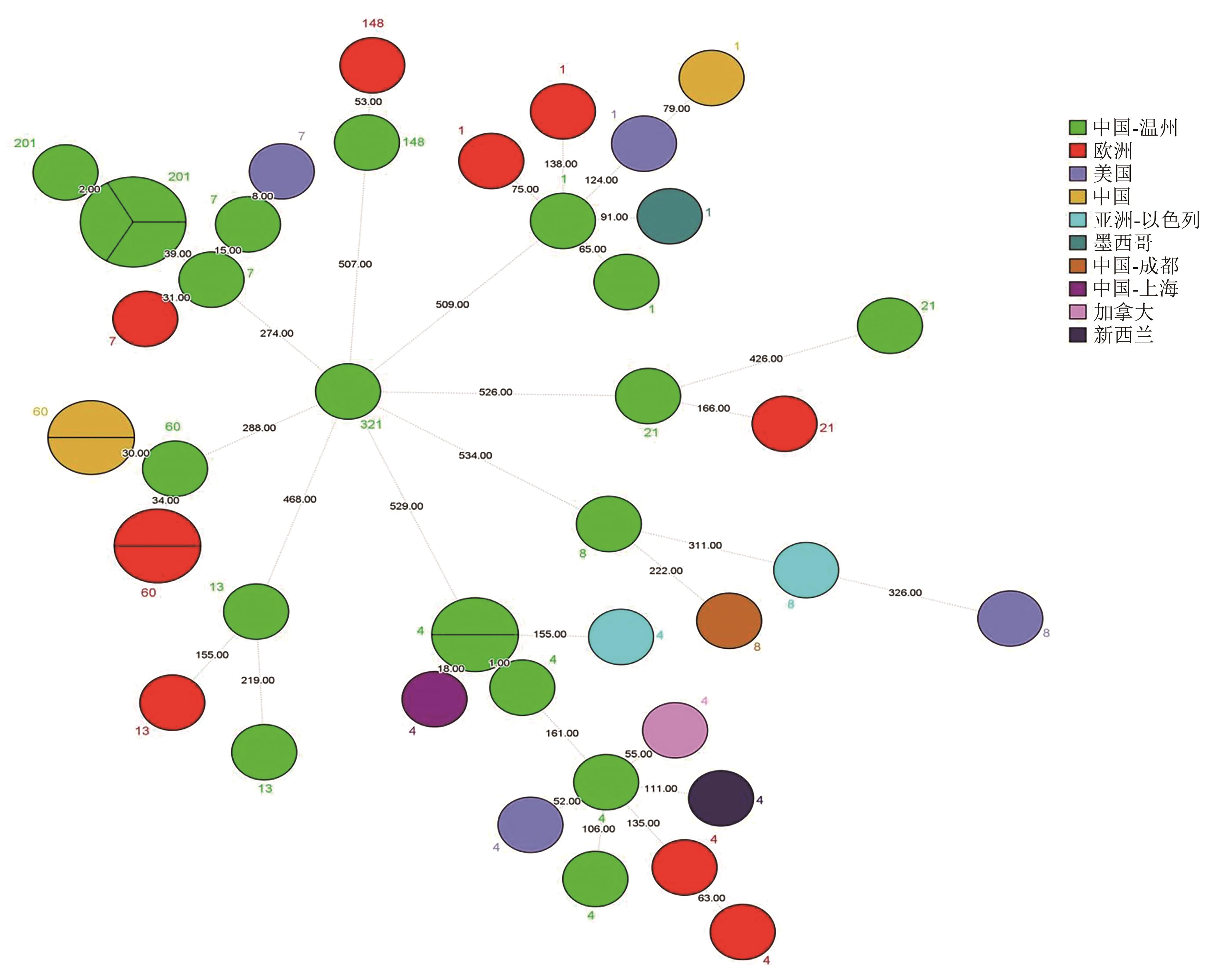 摘要:目的 了解和掌握温州地区腹泻患者克罗诺杆菌感染状况及其菌株分子流行特征,为该地区克罗诺杆菌引发的食源性疾病防控提供科学依据。方法 2013—2024年对温州地区食源性疾病腹泻患者样本,开展克罗诺杆菌检测并对分离的菌株进行菌种鉴定、分子血清分型、全基因组测序,并进行聚类分析,同时分析毒力、耐药相关基因携带情况。结果 在1 816份样本中,共检出21株克罗诺杆菌,总分离率达到1.16%。年龄分布上,18~60岁年龄段占比38.10%,<1岁占比33.33%。发病时间上,春季检出占比38.10%,夏季占比33.33%。分离菌株中,阪崎克罗诺杆菌14株,占总菌株数的66.67%。阪崎克罗诺杆菌可分为4个血清型及1个未分型,其中Csak O1为主要血清;丙二酸盐克罗诺杆菌分为2个血清型,以Cmal O2为主要血清型。21株克罗诺杆菌经鉴定,共分为10个ST型和8个克隆群(CC),其中CC7和CC4为主要克隆群,ST4型和ST201型为主要ST型。21株菌株的基因注释结果显示,均携带17个与运动、与黏附和侵袭性等相关的基因。此外,共筛选出15个耐药基因,多数菌株携带11~14个耐药基因。结论 在温州地区由克罗诺杆菌引发的食源性腹泻病例中,需重点关注婴儿群体的克罗诺杆菌感染问题。Csak O1和Cmal O1为主要血清型,CC4、CC7为主要克隆群,ST4型、ST201型为主要ST型。